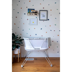 - Gentle under-mattress lift (~7°) for a consistent, supported bassinet surface