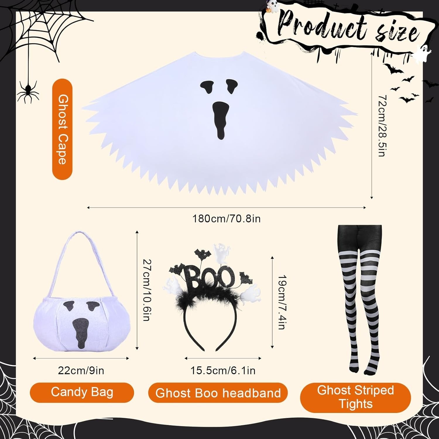 - [Complete Halloween Costume Ensemble] This ghost costume set includes a ghost costume poncho, a ghost headband, a ghost candy bag, and black-and-white Nylon Striped Tights, offering a full and cohesive look for your Halloween festivities
